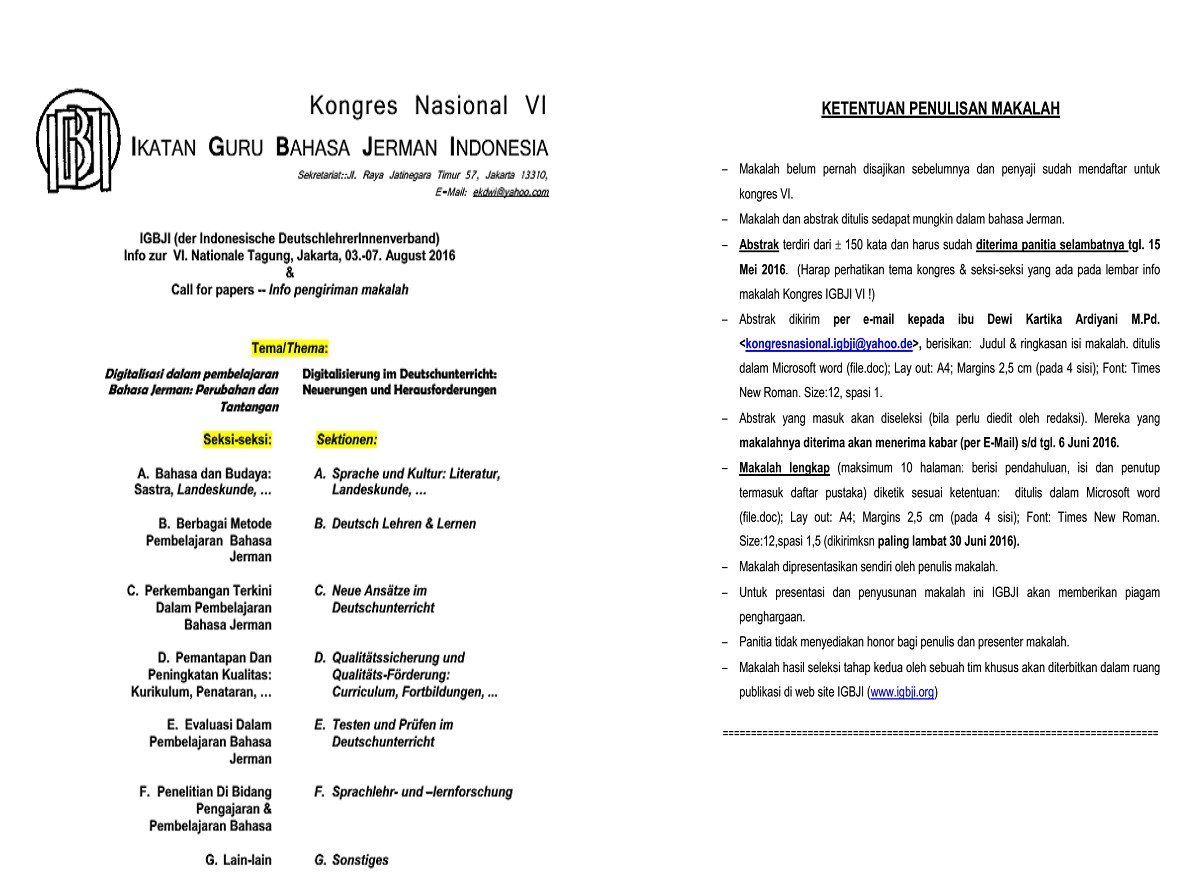 Berikut kami sampaikan perubahan jadwal batas akhir pengiriman abstrak dan makalah untuk kongres nasional IGBJI VI 2016. Abstrak selambat-lambatnya dikirim pada tgl. 15 Juni 2016 ke alamat Email: Diese E-Mail-Adresse ist vor Spambots geschützt! Zur Anzeige muss JavaScript eingeschaltet sein! . Mereka yang abstraknya diterima akan menerima kabar (per E-Mail) pada tanggal 1 Juli 2016. Selanjutnya abstrak yang diterima dilengkapi makalah yang harus dikirimkan paling lambat tanggal 16 Juli 2016.